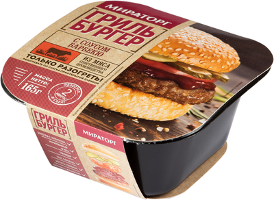 Состав: Котлета из говядины (говядина, соевый белок, пшеничная клетчатка, шрот соевый пищевой, сухари панировочные из хлебных сухарей высшего сорта (крошка сухарная), вода питьевая, соль, регулятор кислотности (трифосфат натрия, пирофосфаты, силикаты натрия), биндаль (сухой сироп глюкозы, загуститель – гуаровая камедь), сп для бургера (экстракт дрожевой, антислеживающий агент – диоксид кремния, коптильный ароматизатор, усилитель вкуса – глутамат натрия) Булка (мука пшеничная хлебопекарная высшего сорта, вода питьевая, сахар, маргарин для выпечки (растительные масла, вода, эмульгаторы (лецитин, моно- и диглицериды жирных кислот), сыворотка молочная сухая, соль, ароматизаторы, регулятор кислотности – лимонная кислота, витамин A и D, краситель бета-каротин), дрожжи хлебопекарные прессованные, молоко пастеризованное, молоко питьевое пастеризованное м.ж.д. 3.2%