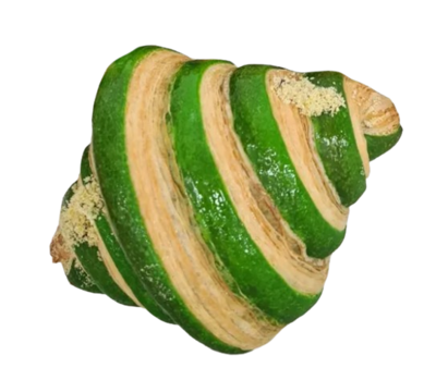 Роскошный и сложный десерт. Это не просто круассан, а целое пирожное: цветной круассан разрезан и наполнен легкими взбитыми сливками, фисташковой пастой. Настоящее произведение кондитерского искусства.