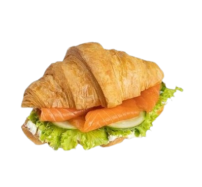 Королевский завтрак. Внутри хрустящего круассана — слабосоленый лосось, нежный сыр моцарелла, свежий огурец и хрустящий лист салата. Соус и специи подчеркивают благородный вкус рыбы.