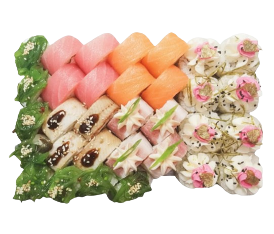 Большой сет для настоящих ценителей. Включает хиты: Филадельфия классическая и с тунцом, роскошный Дракон, свежий Грин маки, а также оригинальные Сибо маки и Хьюмен маки. Идеальный выбор для компании. Васаби, имбирь и соевый соус не входят в стоимость.