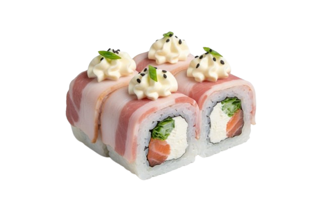 Оригинальный авторский ролл с необычным сочетанием вкусов. Ароматный бекон и нежный лосось гармонично сочетаются со сливочным сыром и сочным томатом. Обратите внимание: васаби, имбирь, соевый соус и палочки не входят в стоимость заказа.