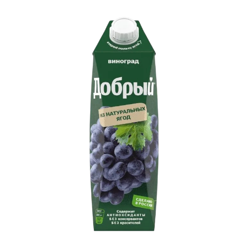 Классический виноградный сок "Добрый", изготовленный из темных сортов винограда. Его сладкий, насыщенный вкус знаком и любим с детства. Этот сок — отличный источник энергии и просто вкусный напиток для всей семьи.