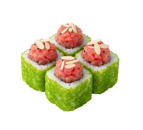 Сложный и многогранный вкус для гурманов. Рубленый лосось (тартар) с крабовыми палочками, томатом и икрой тобико. Миндаль и соус чили добавляют пикантности и хруста. Обратите внимание: васаби, имбирь, соевый соус и палочки не входят в стоимость заказа.