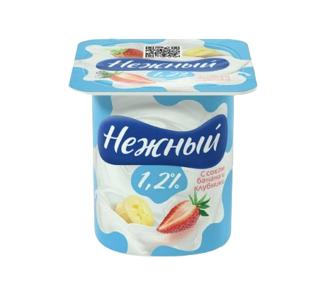 Состав: Обезжиренное молоко, сливки, вода, сахар, глюкозно-фруктозный сироп, загуститель - модифицированный крахмал, сухая молочная сыворотка, фруктовый наполнитель (концентрированный сок банана, концентрированный сок клубники, вода, загуститель - модифицированный крахмал, ароматизаторы "клубника" и "банан" идентичные натуральным, красители: кармин, бета-каротин, регуляторы кислотности: цитрат натрия, лимонная кислота), загуститель - пищевой желатин, лактоза, с использованием закваски. Изготовлено с использованием сухой молочной сыворотки.