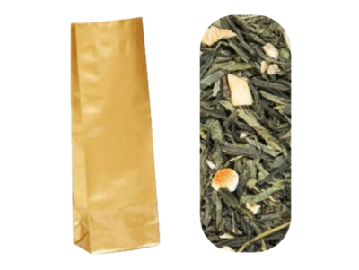 Китайский зелёный чай сенча с кусочками имбиря, лимонной травой, цедрой апельсина и оригинальным освежающим ароматом.
