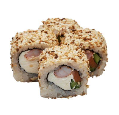 Роскошное сочетание даров моря. В этом ролле встретились сочная креветка и нежный лосось, дополненные сливочным сыром и свежим огурцом. Сверху ролл посыпан кунжутом. Обратите внимание: васаби, имбирь, соевый соус и палочки не входят в стоимость заказа.