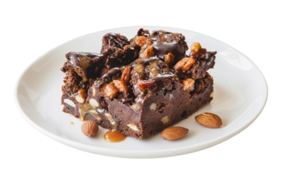 Шоколадный десерт с мягкой карамелью, цельным миндалём, грецким орехом и карамелизированным орехом пекан.