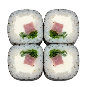 Мини-ролл с благородным тунцом. Нежное филе тунца и сливочный сыр, завернутые в рис и нори. Простой, но изысканный вкус. Обратите внимание: васаби, имбирь, соевый соус и палочки не входят в стоимость заказа.