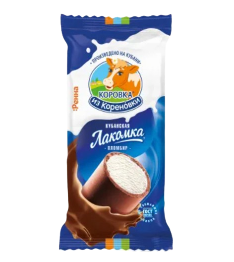 Легендарная "Лакомка". Нежный ванильный пломбир, окутанный слоем взбитой шоколадно-сливочной глазури. Она мягкая, тает во рту вместе с мороженым, создавая неповторимое ощущение.