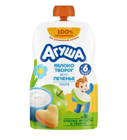 Пюре Агуша "Я Сам" Яблоко-Творог-Печенье — это полноценный и сбалансированный полдник для малыша. Творог является источником кальция, а печенье и фрукты дают энергию. Обладает нежным, сливочно-фруктовым вкусом. Отличный выбор для сытного перекуса.