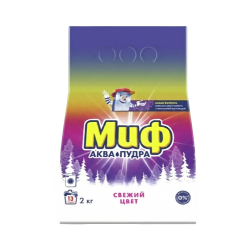 Стиральный порошок Миф Аквапудра Свежий Цвет специально разработан для сохранения яркости цвета и придания свежести, с технологией против разводов. Стиральный порошок Миф Аквапудра растворяется едва коснувшись воды, и моментально активируется: удаляет даже трудновыводимые пятна и придает одежде сияющую чистоту. С помощью технологии против разводов, Миф помогает эффективно справляться с загрязнениями, не оставляя разводов на одежде. Только чистота и морозная свежесть! ПРЕИМУЩЕСТВА МИФ АКВАПУДРА: - Новый, улучшенный аромат - Яркие цвета и свежесть - Новая формула с технологией против разводов - Не содержит фосфатов и хлорного отбеливателя - Удаляет трудновыводимые пятна, оставляя только яркость цвета и свежий аромат чистоты Миф тщательно подбирает ингредиенты для своих средств. Мы не используем фосфаты и никогда не использовали хлорные отбеливатели. Для отбеливания мы подбираем кислородосодержащие отбеливатели и безопасные дозировки. Все активные компоненты полностью биоразлагаемы.