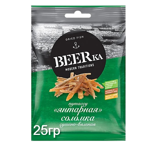 Янтарная соломка BEERka — это аппетитные полоски сушеного рыбного филе с добавлением перца. Обладает красивым золотистым цветом и пикантным, в меру острым вкусом.
