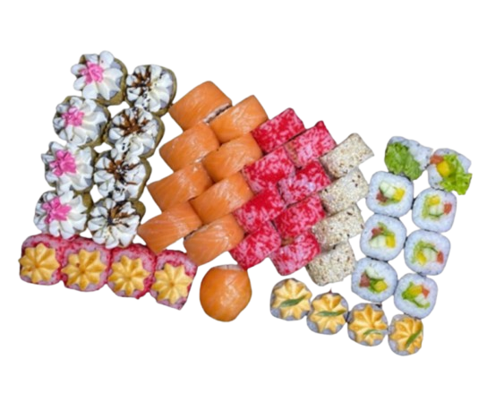 Большой дегустационный сет. Здесь собраны хиты меню: от классической Филадельфии и Калифорнии до горячих Сяке хотто и запеченных Аризона. Васаби, имбирь и соевый соус не входят в стоимость.