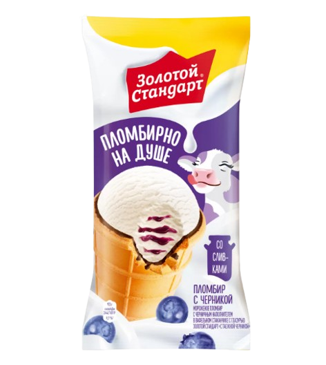 Мороженое Золотой Стандарт Черника — это сливочный пломбир с добавлением натурального черничного джема, который создает мраморный узор и ягодный вкус.