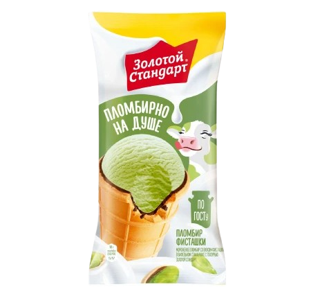 Мороженое Золотой Стандарт Фисташка — это ароматный фисташковый пломбир в хрустящем вафельном стаканчике. Нежный ореховый вкус и сливочная текстура.