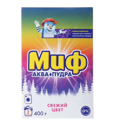 Стиральный порошок Миф Аквапудра Свежий Цвет специально разработан для сохранения яркости цвета и придания свежести, с технологией против разводов. Стиральный порошок Миф Аквапудра растворяется едва коснувшись воды, и моментально активируется: удаляет даже трудновыводимые пятна и придает одежде сияющую чистоту. С помощью технологии против разводов, Миф помогает эффективно справляться с загрязнениями, не оставляя разводов на одежде. Только чистота и морозная свежесть!