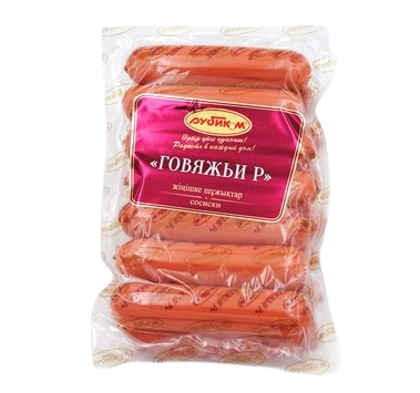 СОСИСКИ «ГОВЯЖЬИ Р» Продукт без свинины. Плотные, мясные и ароматные сосиски. Состав: говядина, мясо птицы, вода, соль, смесь специй (сахар, тмин, чеснок, экстракты пряностей). Срок хранения: 60 суток от +2°С до +8°С.